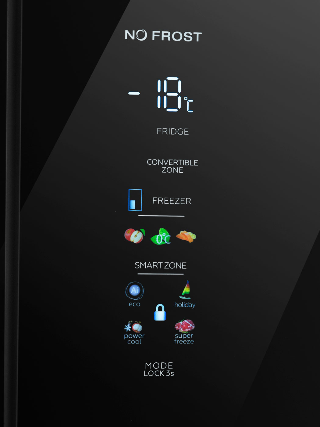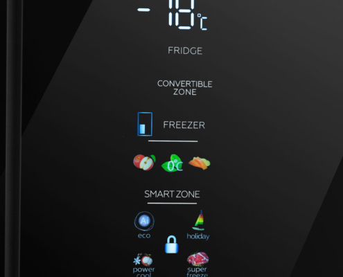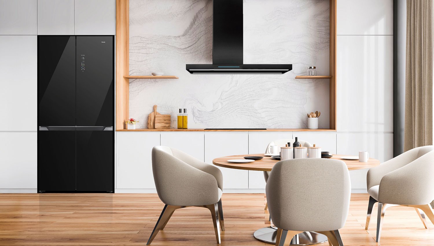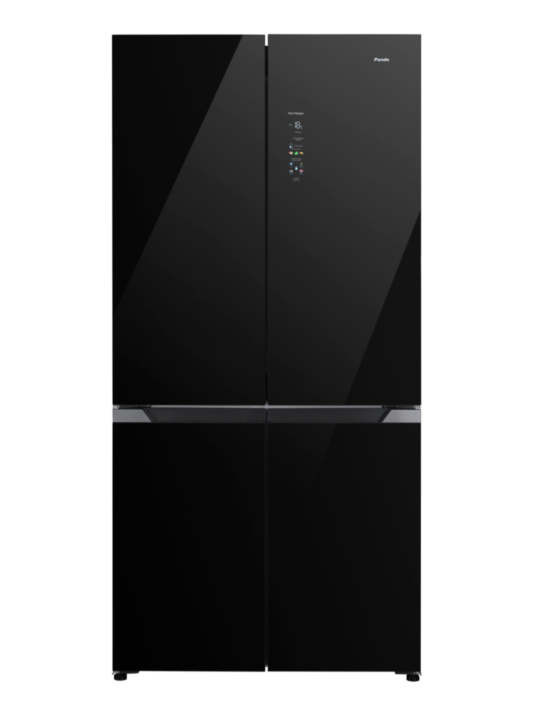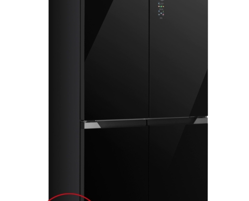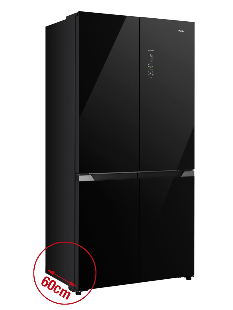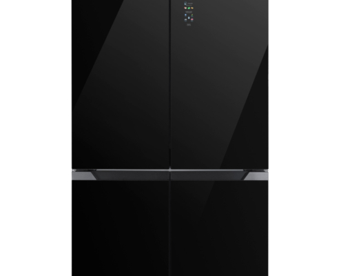 Frigorifero americano a quattro porte con finitura in vetro nero e profondità ridotta (597 mm) che facilita la sua perfetta integrazione con l’arredamento.